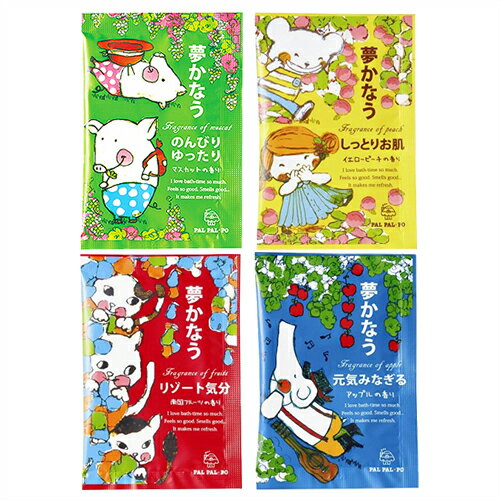 商品詳細 製品名 PAL PAL・PO(パルパルポー) 内容量 20g (1回分) 香り アップル イエローピーチ マスカット 南国フルーツ 商品説明 個性豊かなキャラクターが登場する色鮮やかなパッケージが特徴的な夢かなうパルパルポー入浴剤シリーズです。